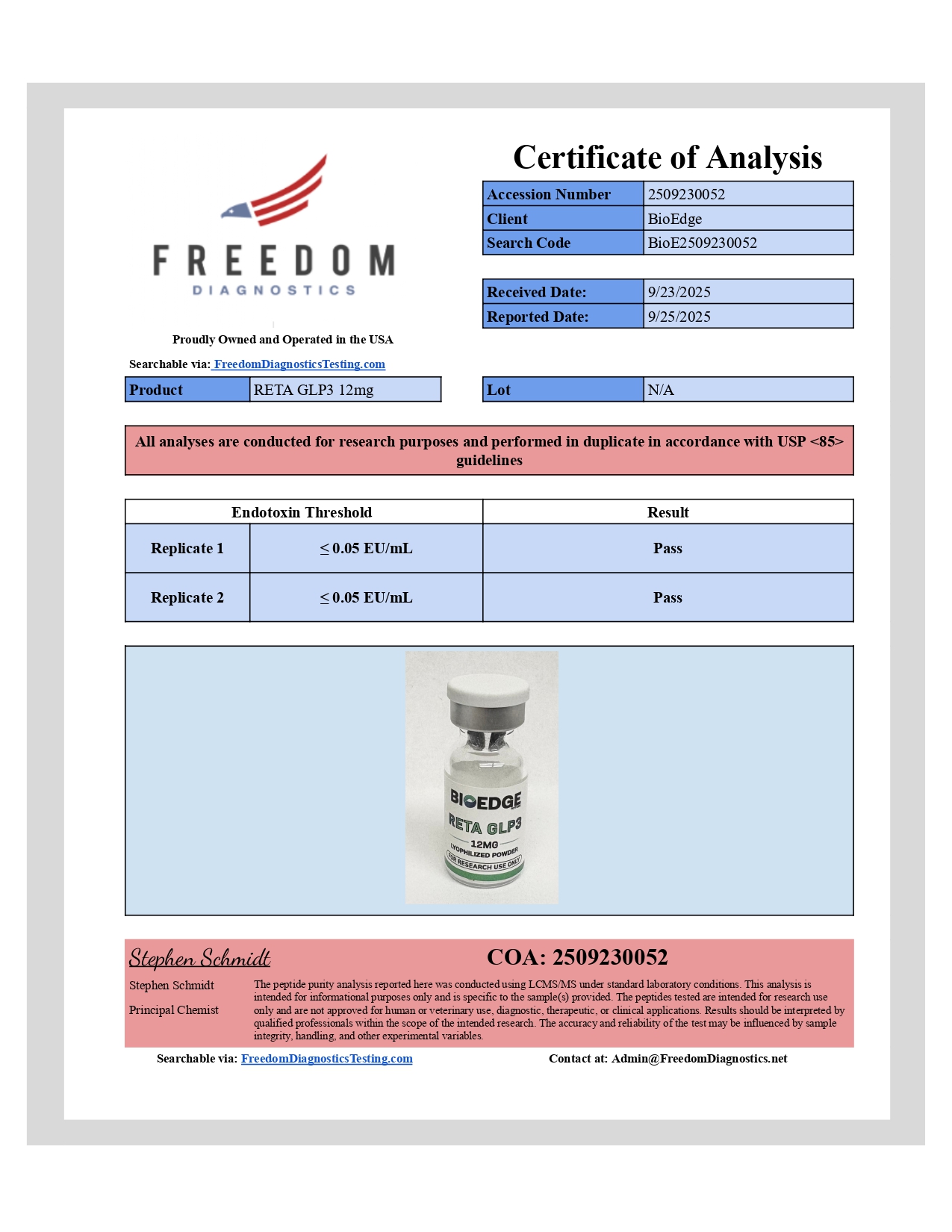 At BioEdge, we are committed to providing research professionals with the highest quality peptides on the market. Every compound we supply is manufactured in a cGMP-certified facility, undergoes rigorous third-party testing, and is intended strictly for in vitro or laboratory research use only.