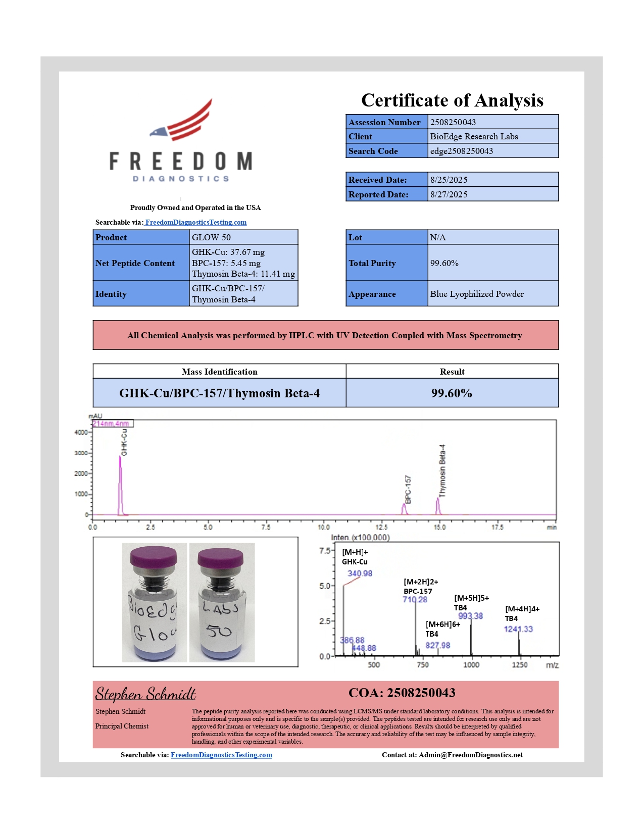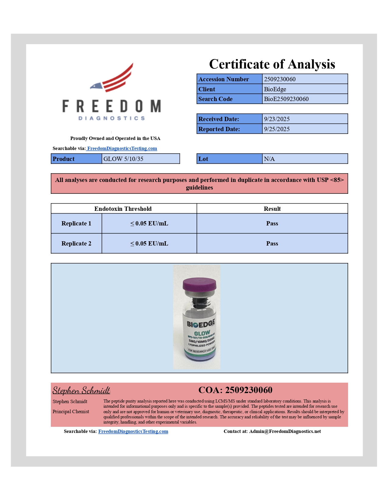 GLOW (BPC-157 + TB-500 + GHK-Cu) from BioEdge Research Labs is distributed solely for in vitro laboratory research.
